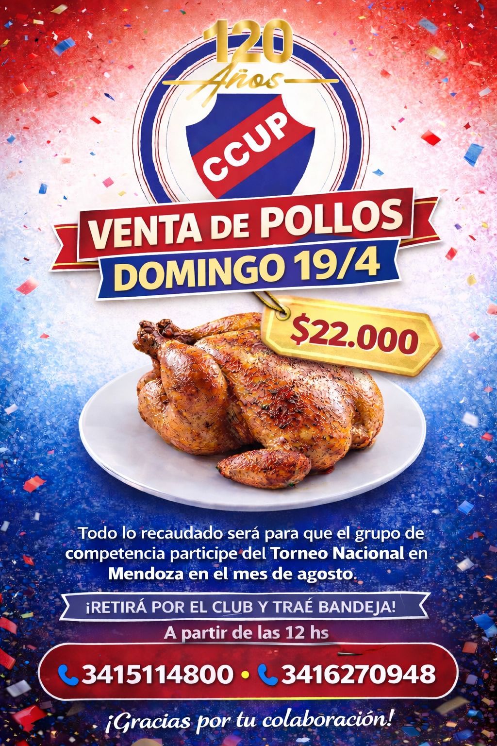 Con el objetivo de reunir los fondos necesarios para afrontar los costos del viaje y la competencia, la escuela de patín organiza una pollada solidaria. La venta será el domingo 19 de abril, con un valor de $22.000 por pollo. La entrega se realizará en el club a partir de las 12 horas, y se solicita a quienes colaboren llevar bandeja.